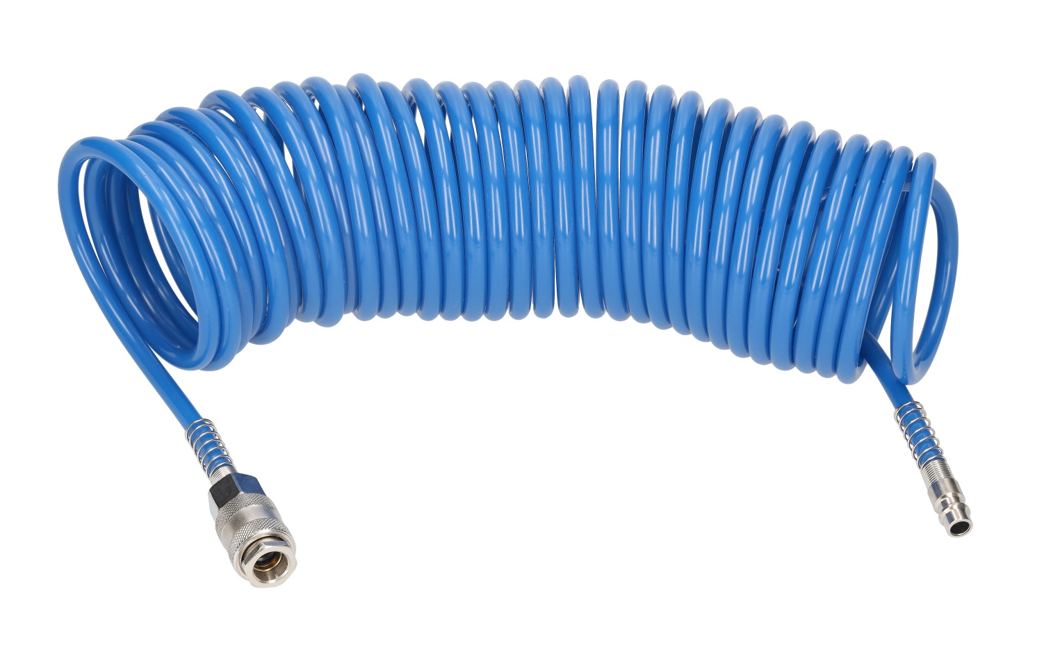 The 8 x 5 mm pneumatic hose is a blue polyurethane coiled hose with a length of 10 m. It is equipped with a quick coupling and a brass plug, reinforced with a spring.