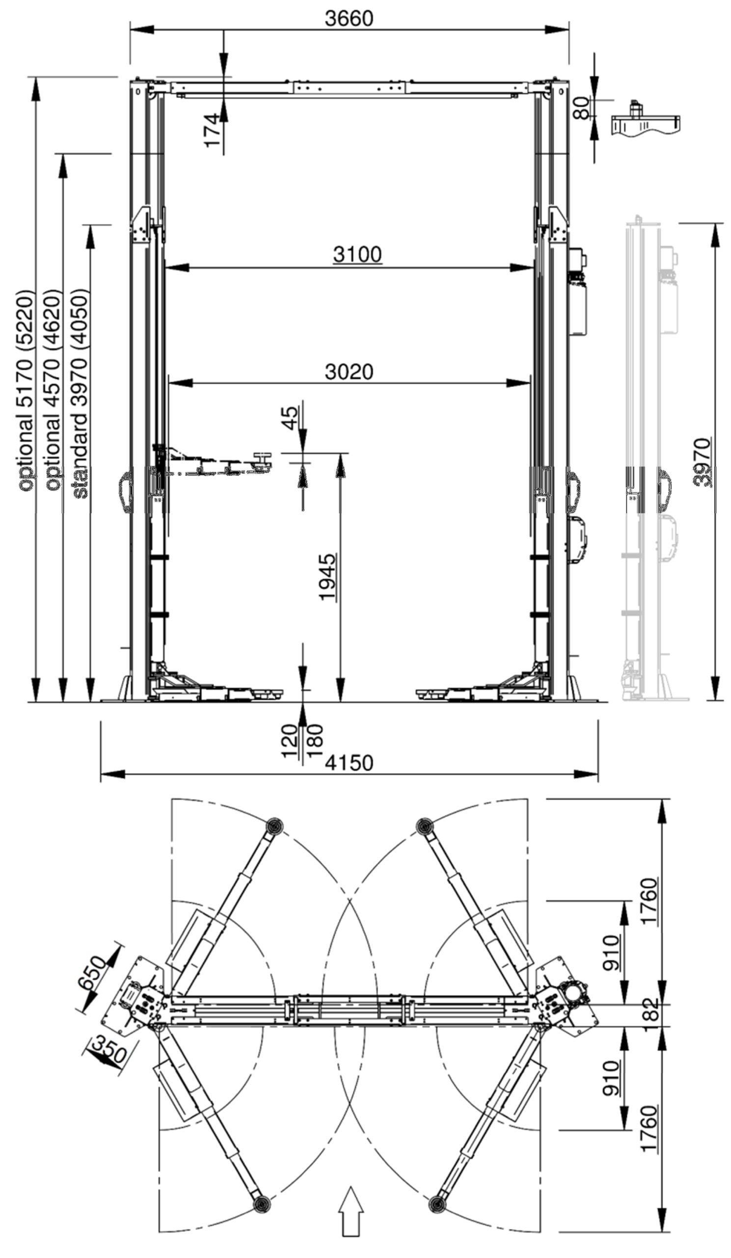 Kaksipilarinostimen korkeus on 4050 mm, siihen on saatavilla kahta jatkopalaa: