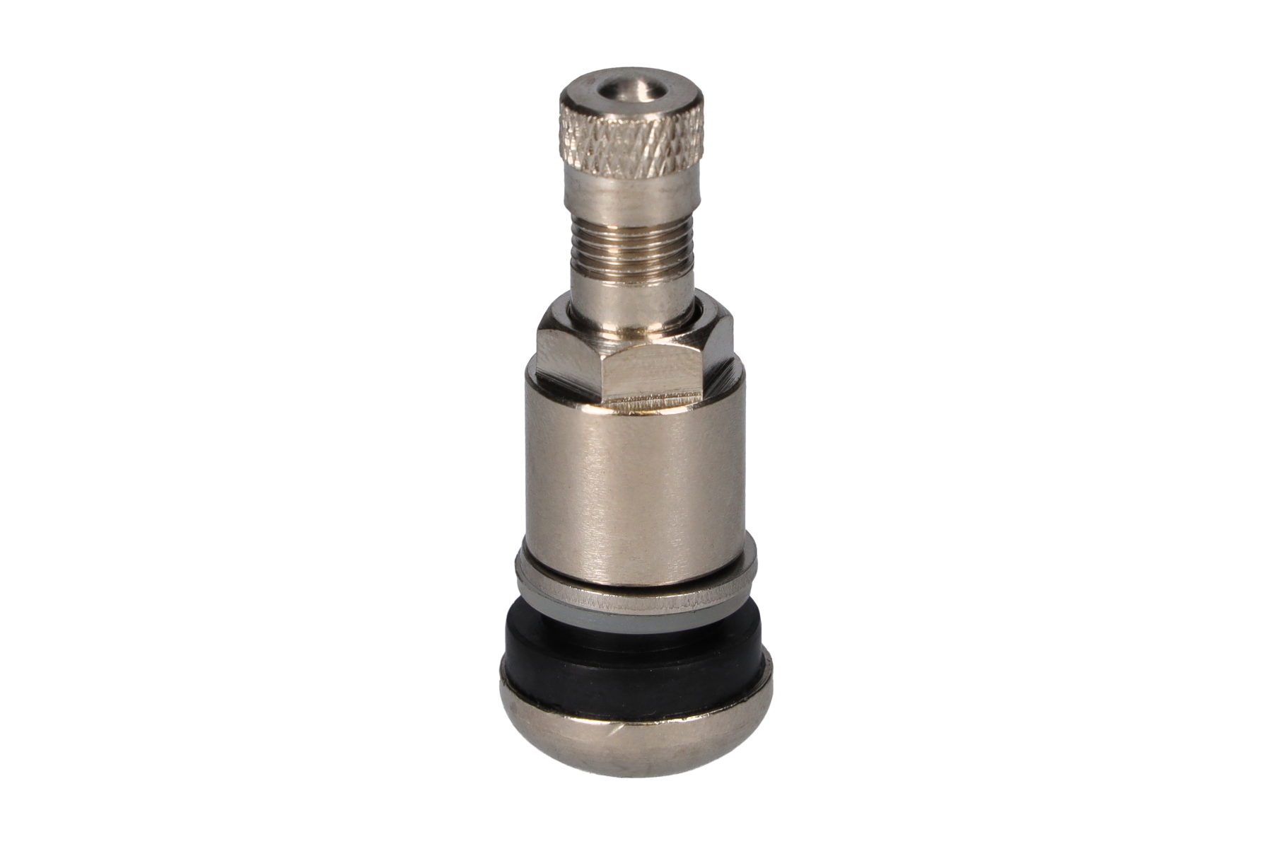 Looking for a durable valve for tubeless passenger-car wheels? Choose this nickel-plated metal clamp-in (screw-in) valve. The clamp-in design provides reliable sealing and excellent resistance to heat and high speeds. The protective polymer washer safeguards the paint/anodized finish on alloy rims and helps reduce galvanic corrosion between dissimilar metals. Key features Metal, nickel-plated clamp-in valve for tubeless passenger-car wheels Rim hole diameter: 11.3 mm (PCD standard for passenger cars) Overall length: 45 mm — easy access on deeper seats, with trims/hubcaps Low-profile base for a clean look and reduced snag risk Tightening torque: 3–5 Nm — use a calibrated torque wrench/driver Protective washer version — improved sealing + rim finish protection Complete kit: gasket (grommet), washer, nut, valve core, cap Why a metal clamp-in valve?Greater durability and temperature resistance than rubber valves; recommended for higher speeds, track use, higher pressures and demanding conditions. The threaded clamp-in assembly with a rubber grommet and nut ensures stable, repeatable sealing. When is the 42 mm stem useful?When the valve seat is recessed (thicker rim bed, specific rim geometry, trims/hubcaps). The longer stem improves access for gauges, inflators and TPMS tools. Protective washer — what’s the benefit?Prevents scratching the rim finish during tightening and provides a barrier between dissimilar metals to limit galvanic corrosion. The washer’s chemical resistance and low friction help achieve even, controlled torque. Installation notes Install on a clean, smooth 11.3 mm valve hole Tighten the nut to 3–5 Nm with a torque wrench/driver After installation, check for leaks and set the correct pressure ApplicationTubeless passenger-car wheels; alloy rims with 11.3 mm valve hole. Recommended for highway use and demanding applications, and where shorter valves are harder to reach due to rim shape.