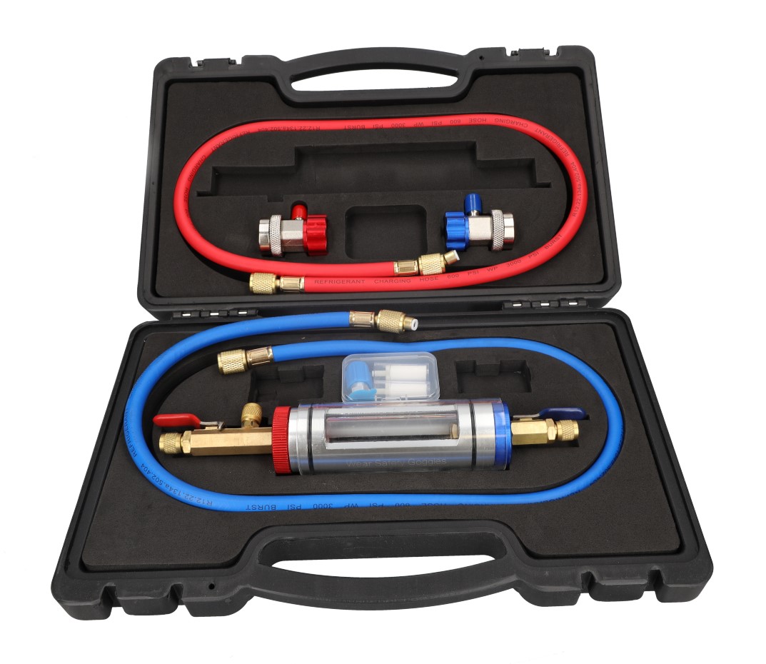 A special kit for assessing the cleanliness of oil in the air conditioning system R134a. Thanks to the transparent cylinder, we can view the inside of the A/C system and check the degree of oil-refrigerant mixing and the presence of UV dye. This allows us to determine: Oil cleanliness Presence of UV dye Moisture content Kit composition: Glass cylinder for observation of the factor with ball valves 2x A/C hose 100 cm 1/4 1/4 SAE HP quick-angle connector 1/4 SAE LP quick-angle connector 2x filter for dispenser 1x adapter