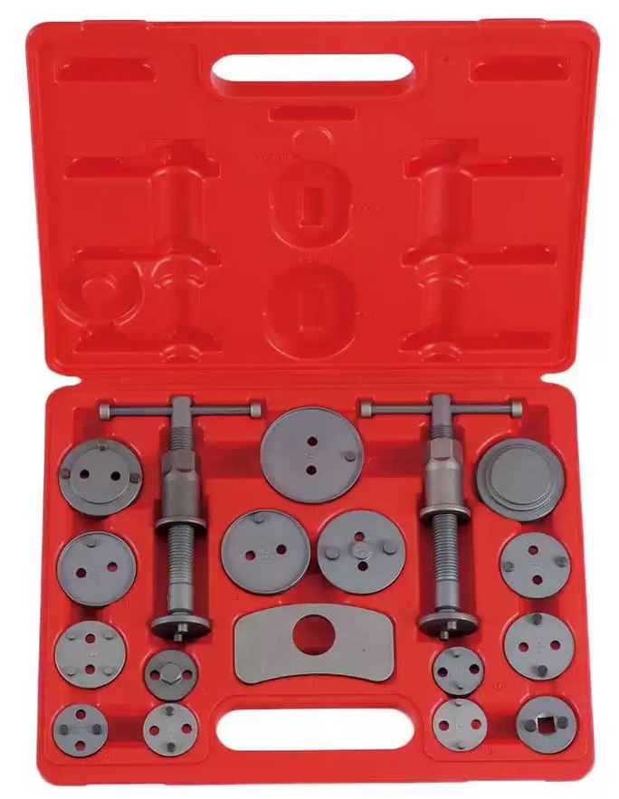 Suitable for many car brands, this tool set is designed for rotating and retracting brake pistons during brake pad and disc replacement. The set includes both left-hand and right-hand spindles, allowing for adjustment on both sides. With this set, you can independently replace your car’s brake pads and discs. To install the new parts, it’s necessary to reset the locked brake pistons. This comprehensive set enables simultaneous rotational movement while applying pressure to the brake piston, preventing damage to rubber seals and dust covers. It provides the right tools for almost every car brand. Contents: 1 Right-hand threaded spindle 1 Left-hand threaded spindle 1 Positioning plate 15 Adapter plates Fits: Citroen Audi Fiat Ford Isuzu Honda Jaguar BMW Nissan Mitsubishi Volkswagen Saab Mazda Toyota