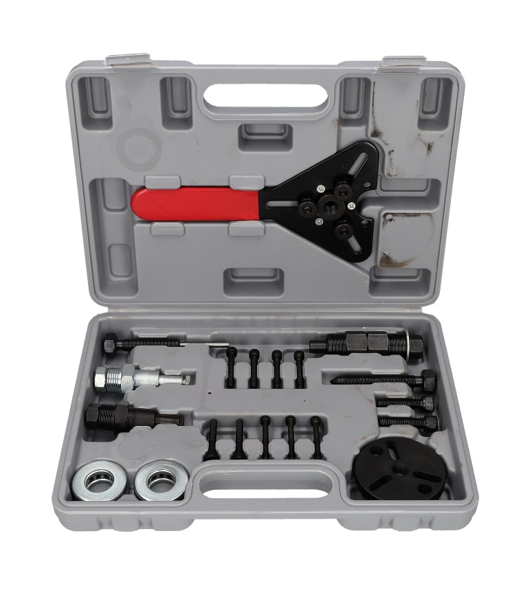 Clutch puller in a car air conditioning compressor. The kit also includes a clutch wrench. The set includes 20 pieces of elements.