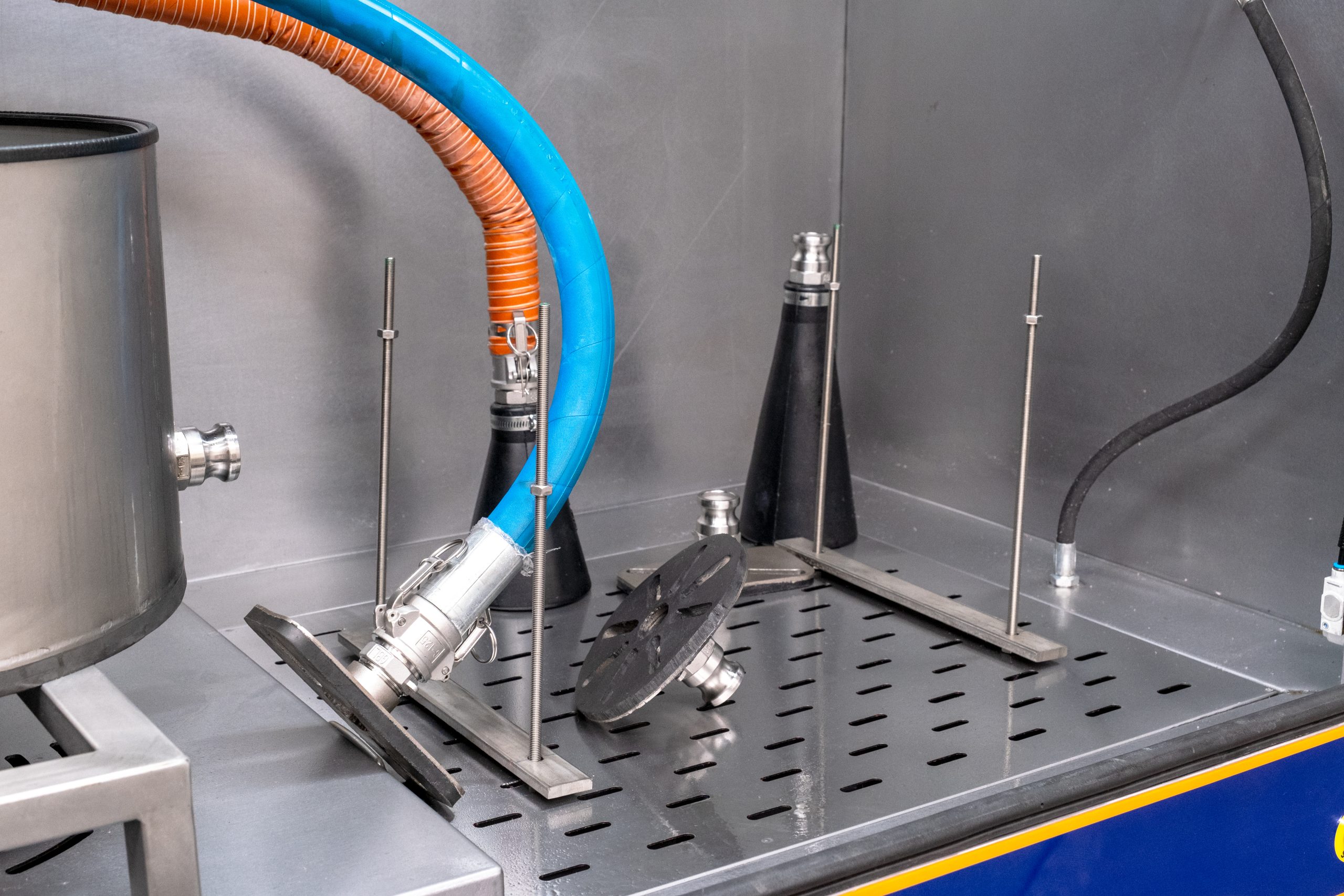 Testausmenettely suoritetaan vastapaineella, aivan kuten autoissa. Kaikki koneen toiminnot ja turvallisuustoimenpiteet ohjataan PLC:llä ja turvareleillä.