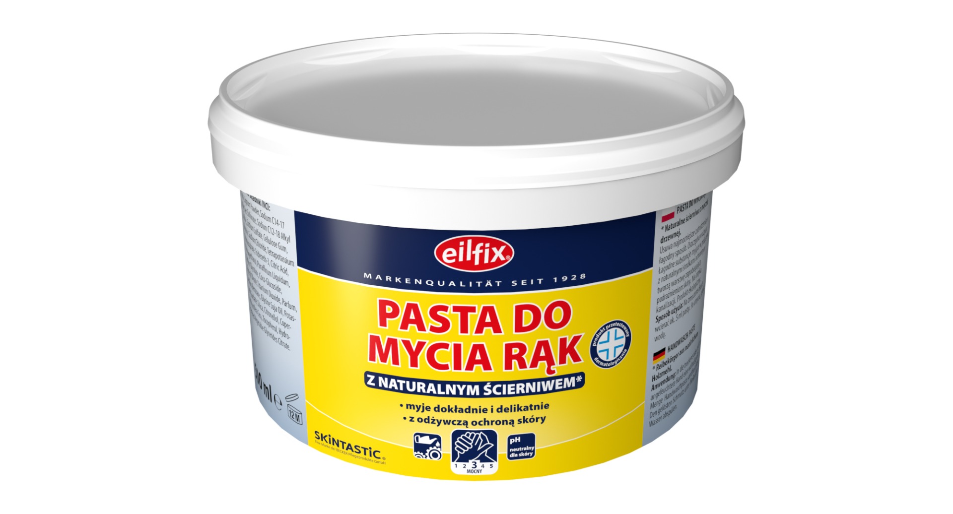 EILFIX hand cleaning paste is a high-quality product designed for effective and gentle skin cleansing. It utilizes mild cleansing agents that are both effective and gentle on the skin. The EILFIX paste is specially formulated to protect the skin from irritation. It utilizes wood flour as an abrasive agent, allowing it to effectively remove stubborn dirt while maintaining gentleness for the skin. The combination of mild cleansing agents with natural protective ingredients and a skin-friendly pH level of 6.0 – 6.5 forms a layer that not only cleanses the skin but also prevents irritation. This is particularly important for individuals working in conditions where the skin is exposed to various chemical or mechanical substances. Instructions for Use Using the paste is simple – apply it to wet hands to allow for effective distribution and dirt removal. Rub approximately 5 ml of paste onto wet hands, then rinse with water. Importantly, EILFIX paste does not clog drains, contributing to its environmentally friendly use. For Professional and Domestic Use Thanks to its properties, EILFIX hand cleaning paste is an excellent choice both in industrial and domestic settings, where effective hand cleansing is necessary while maintaining healthy and well-groomed skin. Key Benefits: Cleansing Effectiveness: EILFIX BHP paste is an effective product for removing stubborn dirt from hands, such as oils, greases, paints, or metal dust. This is particularly important in industrial or automotive sectors where workers have frequent contact with hazardous substances. Skin Safety: EILFIX hand paste contains ingredients that are gentle on the skin, preventing irritation or dryness after use. Additional Information EILFIX hand cleaning paste is a cosmetic product. For cosmetic products, there is no obligation to issue Safety Data Sheets, which is in accordance with the REACH regulation – Article 2, point 6 B, the provisions of Title IV of which do not apply to cosmetic products defined in Directive 76/768/EEC.