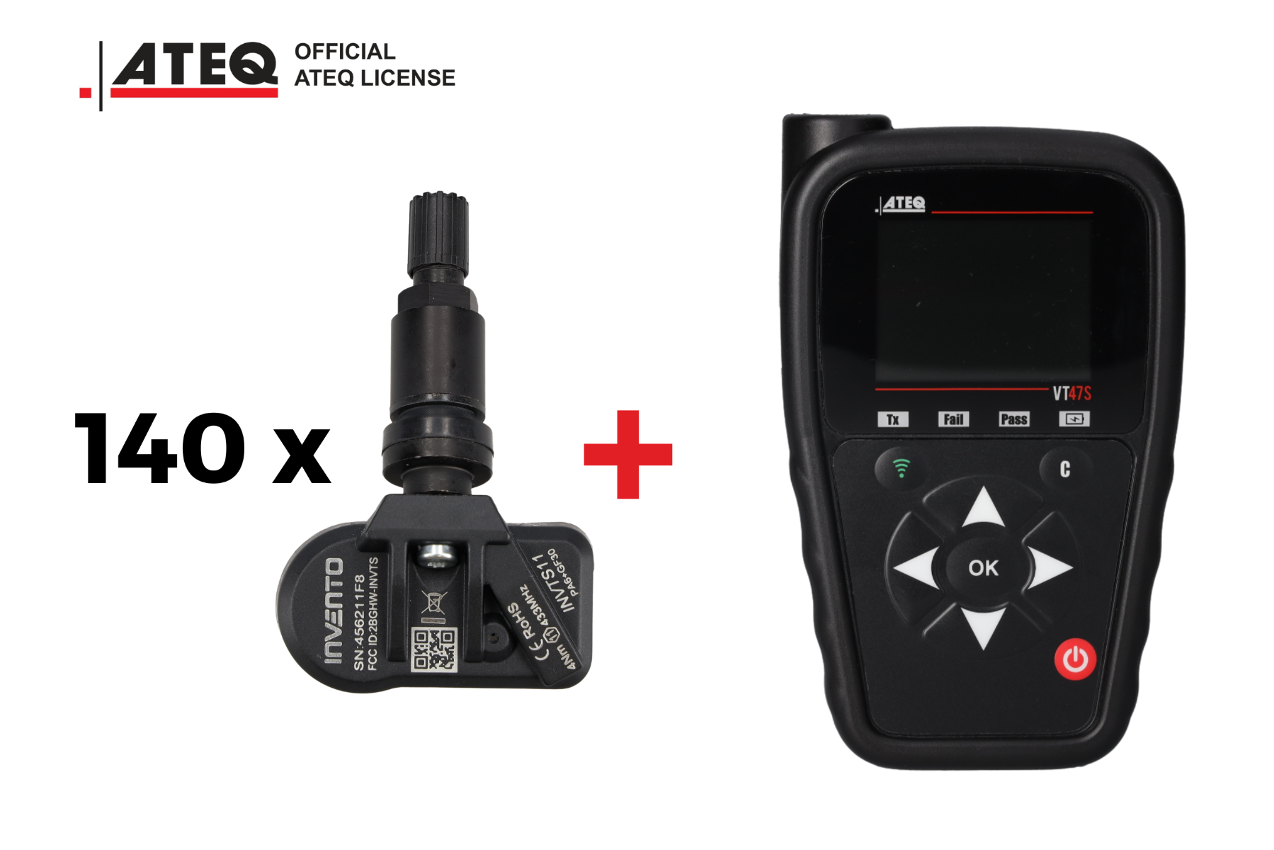 SET of 140 pcs INVENTO ALL-SENSOR + ATEQ VT 47S INVENTO ALL-Sensor TPMS sensors – the best quality in tire pressure monitoring! Our sensors are equipped with a frequency of 433/315 MHz, which is one solution for both electric and wireless vehicles. The solution allows you to replace up to 98% of OE regulations on the European market, which facilitates warehouse management. INVENTO ALL-Sensors are supplied with ATEQ!
