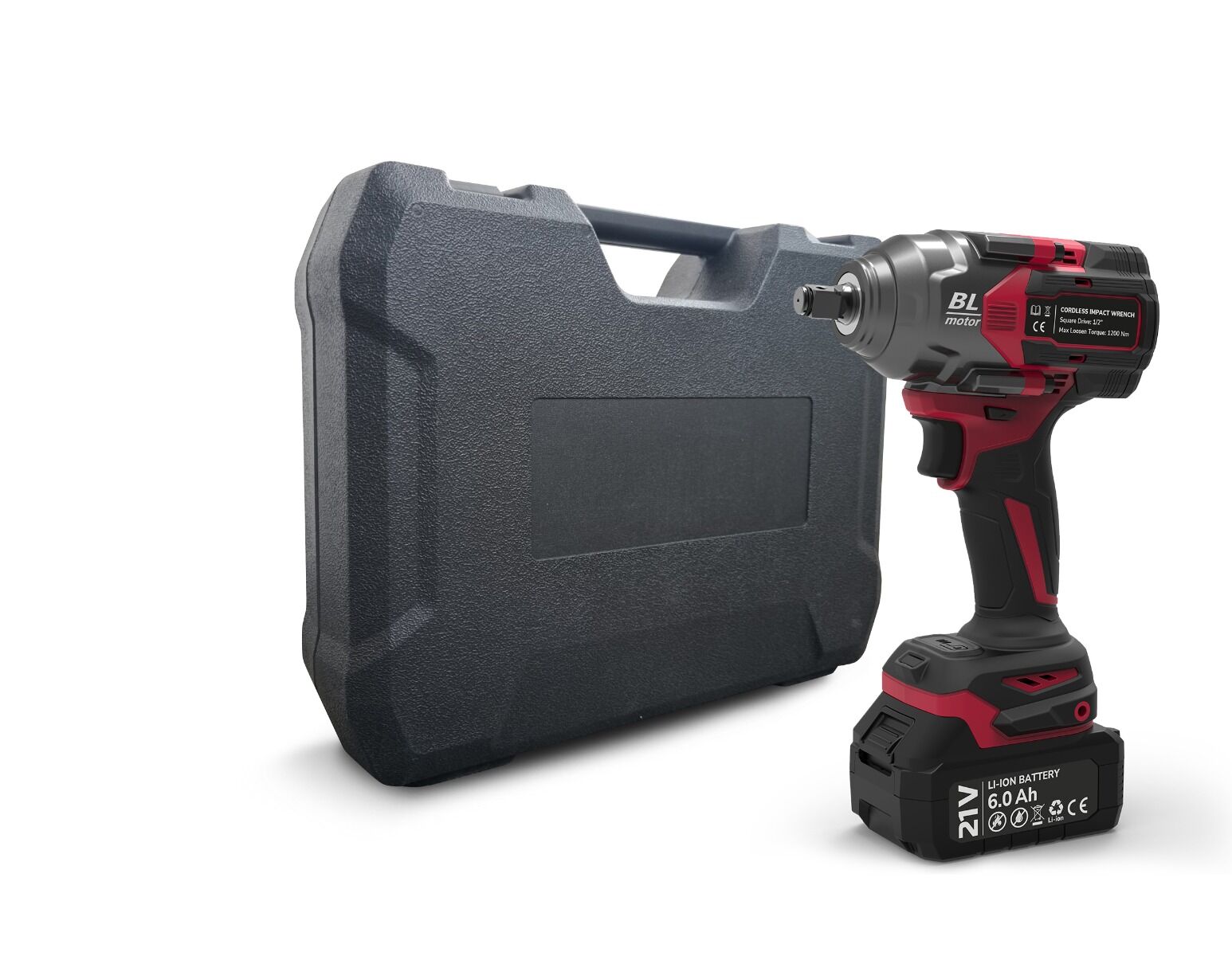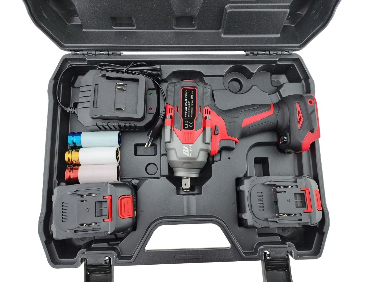 Laitteen mukana tulee kaksi akkua, laturi ja kolme yleisintä hylsyä (17/19/21 mm).