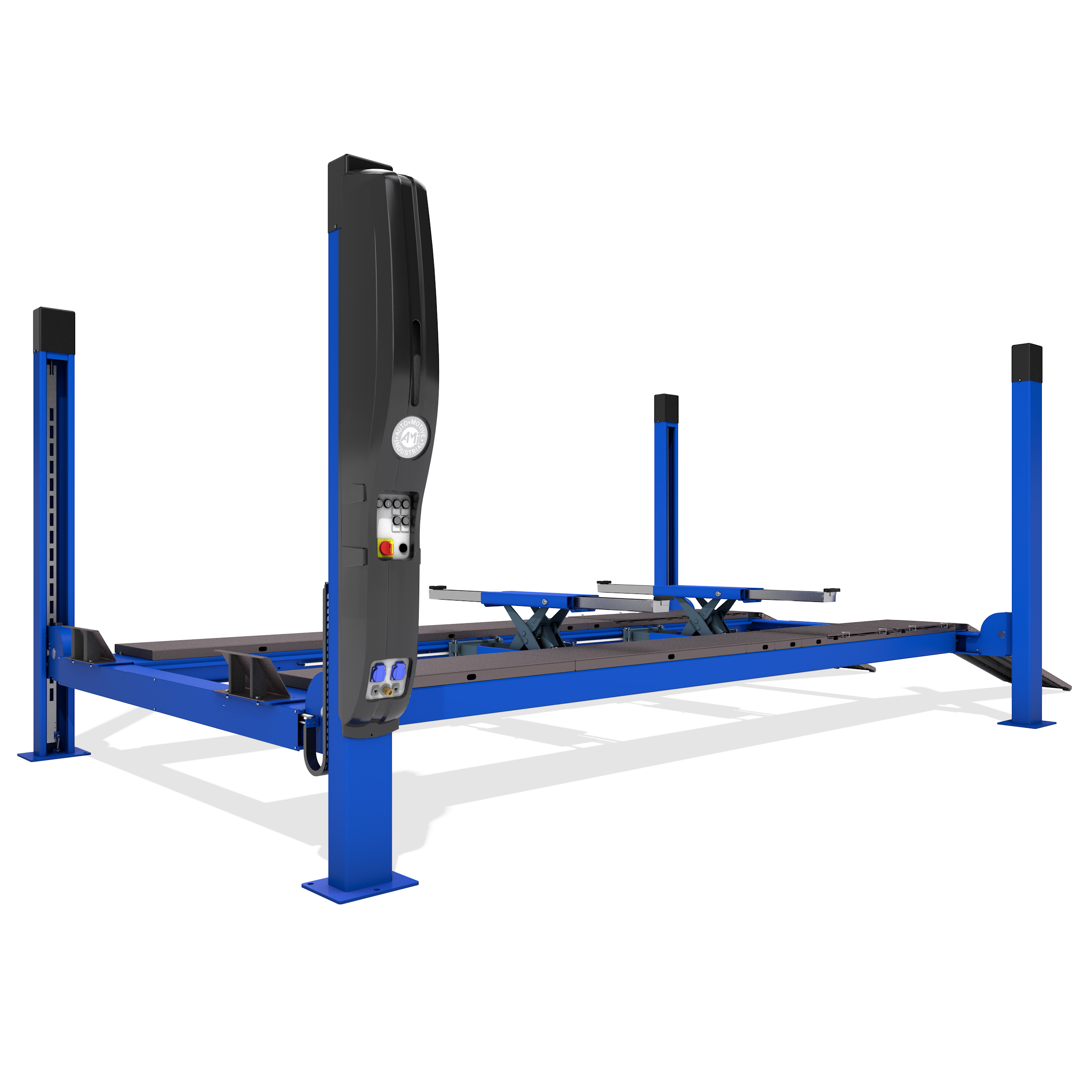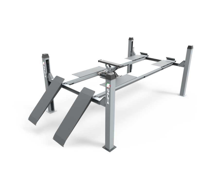 Sähköhydraulinen 4-pilarinostin, jonka nostokapasiteetti on 3 500 kiloa ja nostokorkeus 175 senttiä.