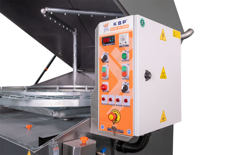 Sivusta täytettävä osienpesukone KSP WM1250 ulosvedettävällä pesukorilla ja sähkömekaanisella ohjauspaneelilla.