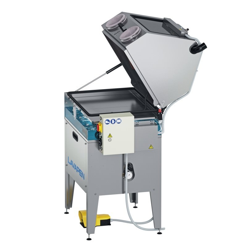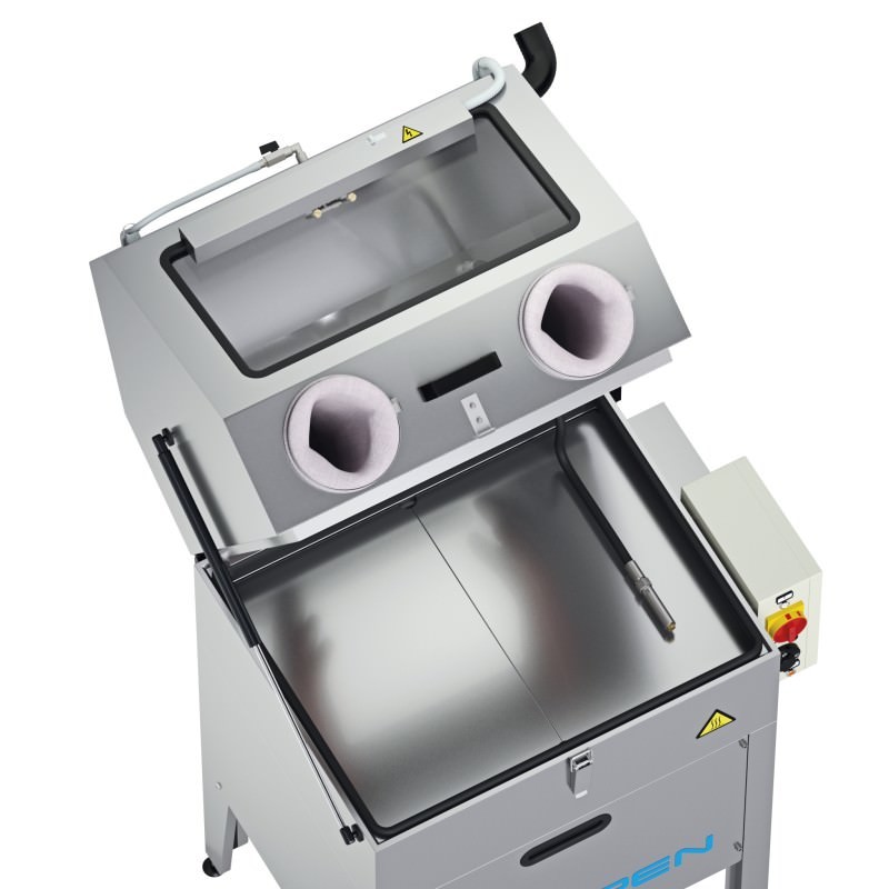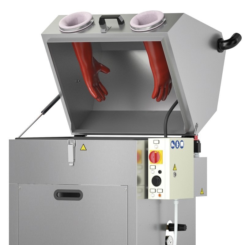 Päältä täytettävä osienpesukone jota ohjataan manuaalisesti kahden neopreeni hanskan avulla. Saatavilla kolmea eri kokoa: