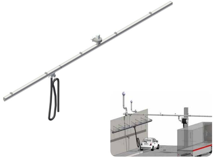 Keen Space GDK -pakokaasurataan kuuluu kisko, puhallin, 7,5 metrin letku, suulake sekä letkun kevennin.
