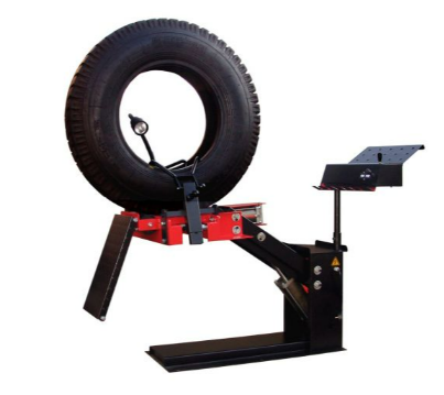 Auxiliary device for reparing truck tyres. Intended Use Designed for professional repairs and inspections of tyres up to 150 kg carried out by tyre service companies. Application The device allows you to lift the tyre to the desired height, rotate it and unseat the beads, thus enabling the tyre to be inspected and repaired. Design The machine has been designed to facilitate professional tyre repairs while ensuring tyre stability and ergonomic working conditions for the vulcaniser. It also has an adjustable light to help with inner tyre repairs. Key construction elements: Base – with holes for permanent fixing to the floor which guarantee the highest stability of the device Lever for lifting/lowering the lifting arm – makes it easier to work with the tyre and to fix it at a convenient height Tool shelf – because of it the necessary materials and tools are always close at hand Rotating rollers – allow to place the tyre in the correct position. Pedal to spread or release the grips. Tyre grips. Directions for use Roll the tyre to be repaired onto the lifting arm with rotating rollers. Using the grip adjustment system, adjust the height and range of the grips depending on the size of the tyre to be repaired so that they fit snugly with the tyre beads. Then use the locking pins Using rotating rollers, place the tyre in a position convenient for repair By pressing on the outside of the pedal, spread the tyre beads to allow easy access to the inside. Tilt the lift control lever away from yourself to raise the tyre to the desired height. To change the position of the tyre, lower the lift by tilting the lever towards yourself, release the beads by pressing on the inside of the pedal and, without removing the grips, change the position Correct positioning of the tyre on the spreader guarantees its full stability and safe work.
