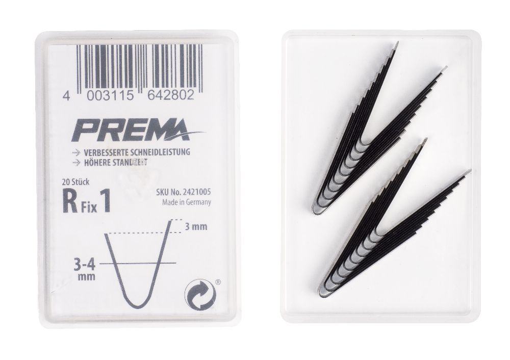 High-quality R Fix 1 round blades suitable for the German tyre cutting machine, Prema Cutter.The blade is used for regrooving the tread pattern on lorry tyres. The German-made blades for cutting machines are perfectly sharpened, which guarantees precise and easy cutting of the rubber. The blades are made from high-grade steel, which means that they retain their sharpness even after repeated use. Durability of the blades is ensured by maintaining the right heating temperature and cleanliness of the clamps in the cutting head of the cutting machine. Details: Cutting width: 3-4 mm, pieces per package: 20 Profile: round Made in Germany
