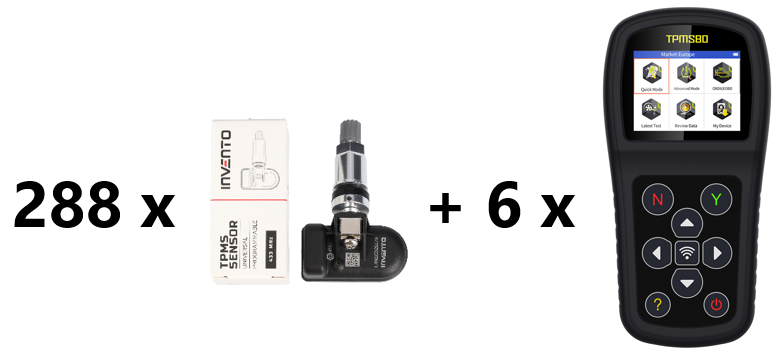 SET of 288 INVENTO sensors + 6 x TPMS80! INVENTO 1-Sensor is a dual frequency 433/315 MHz programmable TPMS sensor that can replace up to 98% of OE sensors available on the market.