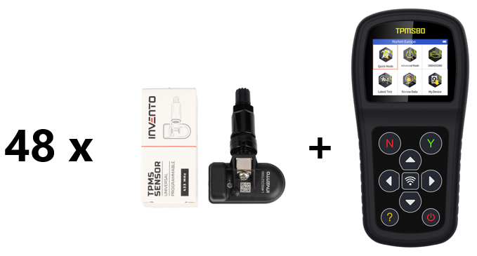 SET of 48 INVENTO sensors + TPMS80! INVENTO 1-Sensor is a dual frequency 433/315 MHz programmable TPMS sensor that can replace up to 98% of OE sensors available on the market.