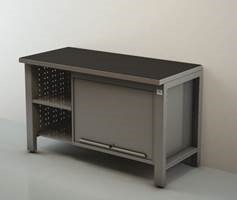 Tukeva 1,5 metriä leveä työpöytä, jossa lukollinen kaappi.