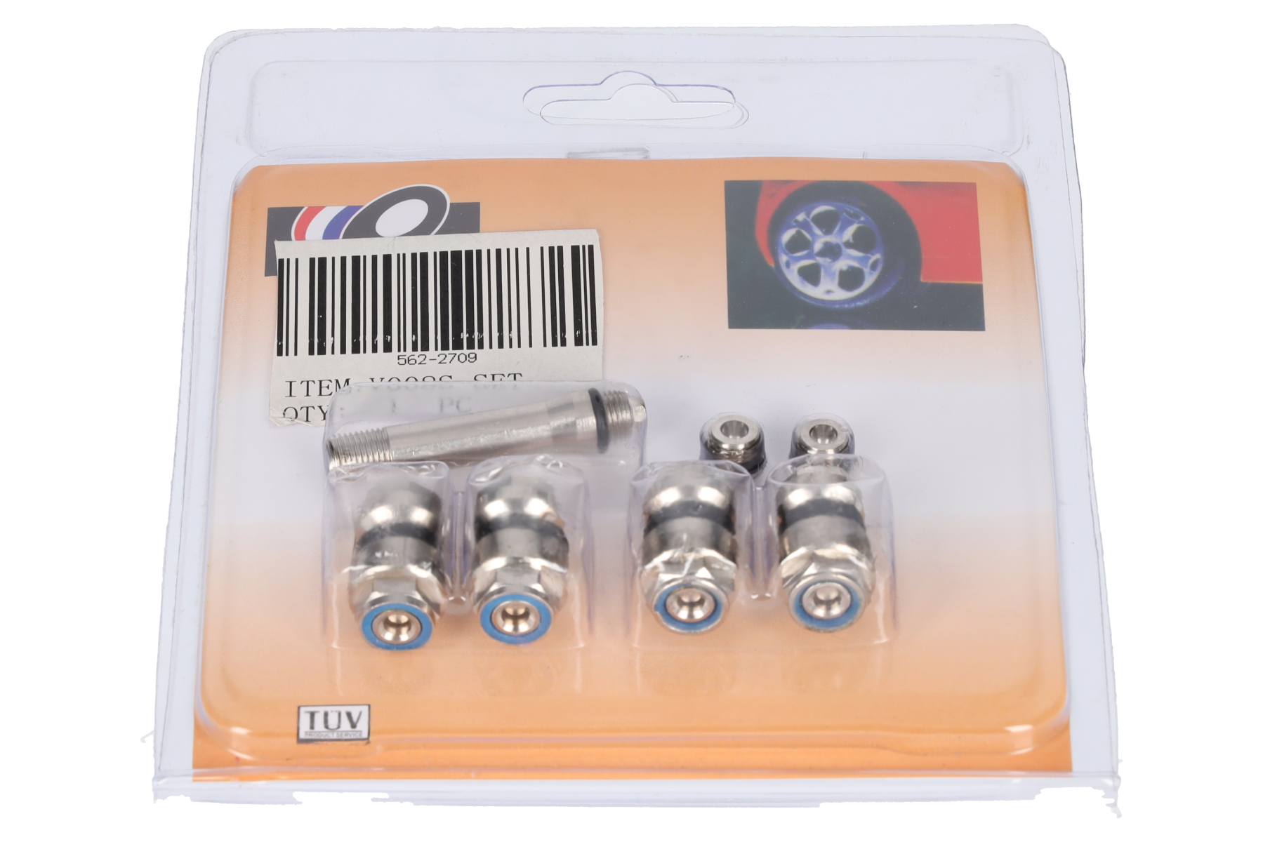 A set of V007 metal detachable valves designed for passenger car wheels. The special design of the valves protects them from loss of pressure, tampering, contamination and detachment.