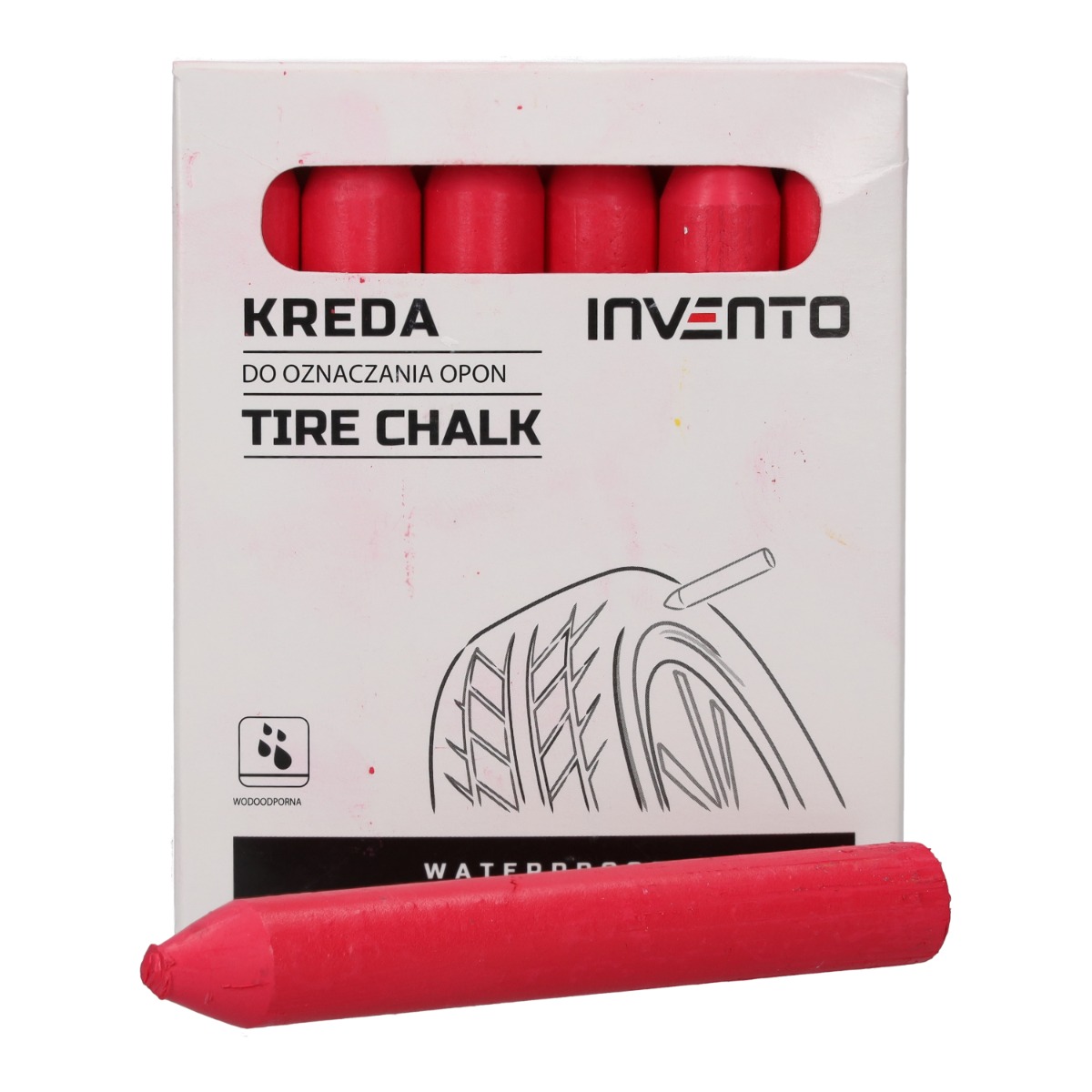 Waterproof red marking chalk INVENTO is a durable, non-toxic, and dust-free solution designed for professional use. The red color ensures high visibility and precise markings, making it especially effective on light-colored surfaces. It provides long-lasting performance whether applied to dry or wet surfaces. The red chalk (marker) is ideal for marking or identifying damage on tires during repairs and is an excellent tool for labeling tires during seasonal tire changes. Its vibrant color ensures that markings stand out clearly for easy identification. This versatile chalk works effectively on virtually any surface, including rubber, metal, and painted materials. With its waterproof properties, it performs reliably in all conditions, maintaining clarity and durability. Each package contains 12 pieces of chalk.
