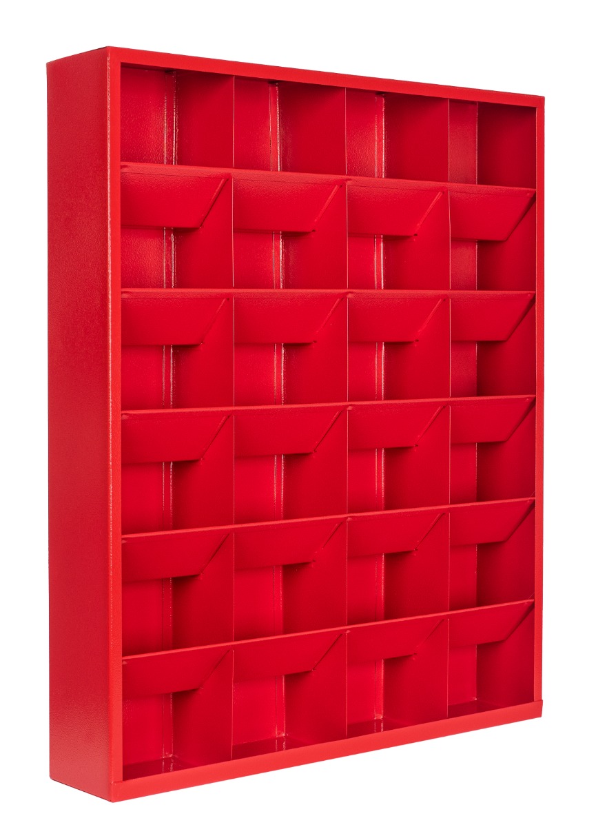 A metal cabinet designed for storing weights. The box is made of metal, protected with red powder paint and has dimensions of 570 mm x 680 mm x 100 mm. The box is equipped with 24 pockets, each measuring 130 x 130 mm. Application: Storage of weights or small items Advantages: Separate compartments allow for maintaining a full range of weights for wheel balancing, It does not have doors, ensuring convenient access to the balancing weights, Helps keep order in the workshop or tire service center.